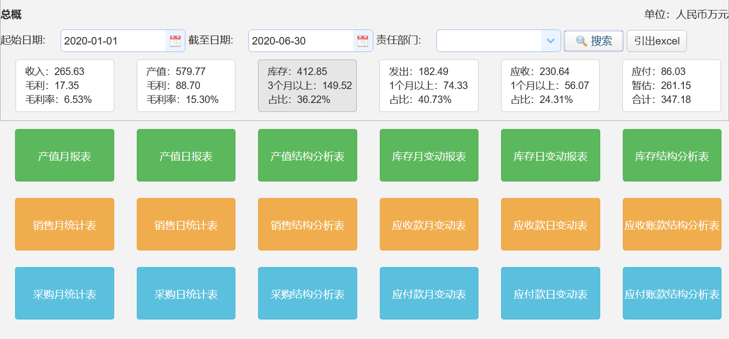 4.数据分析实时完成,图表展示产值、库存、销售、应收、采购、应付等信息实时更新。