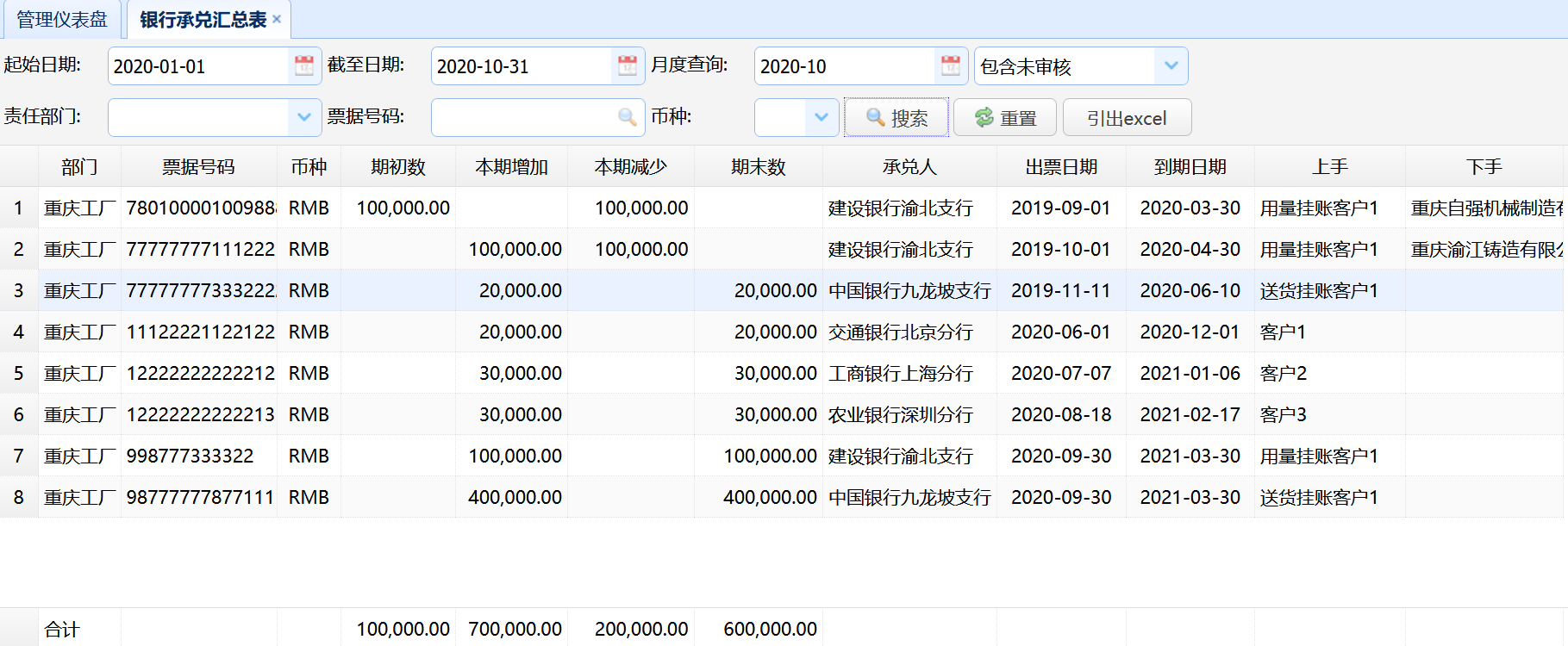 票据台账自动生成,完整披露:票据编号、承兑人、开票日期、到期日期、金额、币种、上手、下手等信息。截止日期可任意选择。