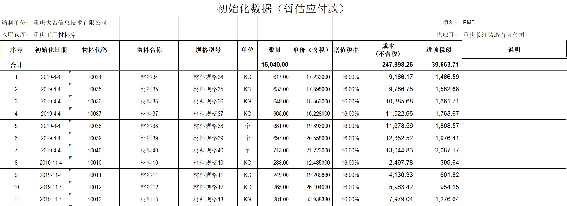 - 提前部署,对截止建账日前一天已入库未办理发票勾稽的采购清单进行清理,编制暂估应付款清单。范例:建账日为2020年1月1日,清查截止日即为2019年12月31日。